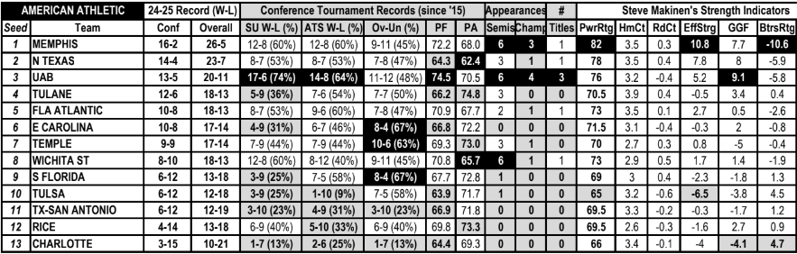 - Opening round single-digit favorites are just 8-14-1 ATS (36.4%) in their last 21 tries in the AAC tourney.
