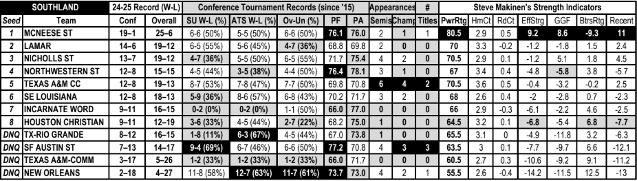 - The Southland Conference tourney has been a favorite-dominated bracket of late, with small favorites of 4.5 points or fewer doing particularly well, going 27-12 SU and 24-15 ATS (61.5%) since 2014.