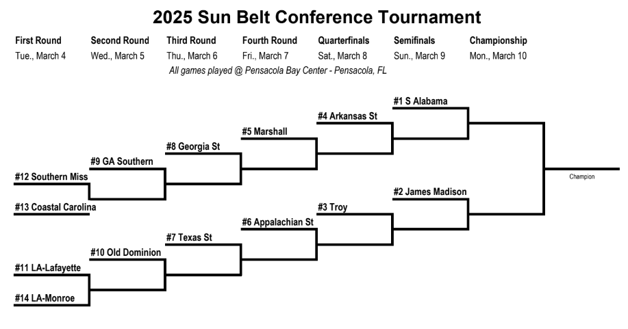 The 2025 Sun Belt Conference Tournament looks a lot different this season and has been discussed at length thanks to its new format. It begins on Tuesday March 4 and ends on Monday March 10 and there are two games every day until we get to the championship game. The top two seeds, No. 1 South Alabama and No. 2 James Madison have a bye to the Semifinals. Seeds 11 through 14 play on Day 1 in the first round, and then the next two seeds get byes each successive day, so No. 9 Georgia Southern and No. 10 Old Dominion play their first game in the second round on Wednesday, No. 8 Georgia State and No. 7 Texas State play their first game in third round on Thursday and so on.