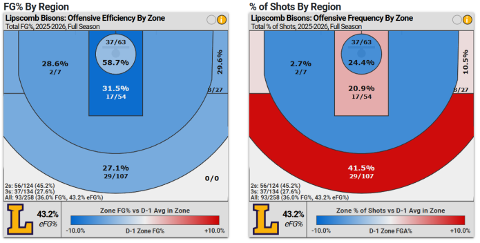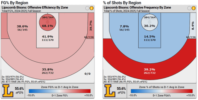 A few things here. The first is that Lipscomb obviously misses the interior presence of Jacob Ognacevic. The notable drop in shot share and FG% at the rim definitely makes it hard to score. Ognacevic was a 73% guy on Close Twos and also a 53.4% guy from the midrange, not to mention a 41.2% guy from 3. They’re also shooting far worse from 3 without that interior presence and also his shooting prowess.