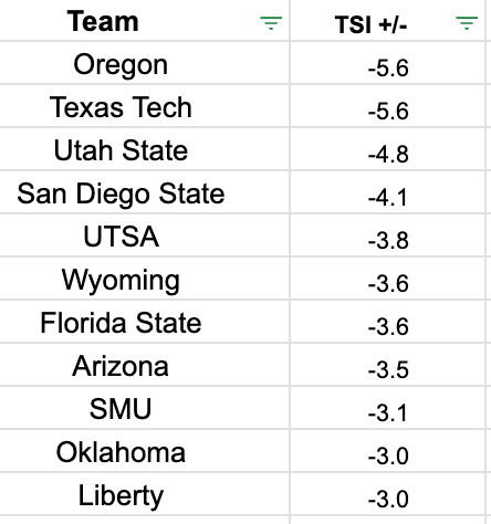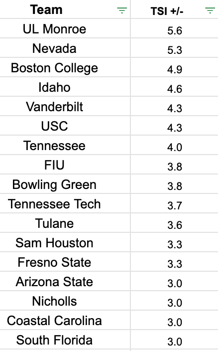 While the (purple) Wildcats are just 7-point favorites at home with an Over/Under of 56.5, TSI projects Kansas State -14 with a total of 59.5. I think this line is short for two reasons: 1. Factoring in too much of Jedd Fisch’s success at Arizona into the number and 2. Not factoring in Arizona’s FCS matchup with Northern Arizona. TSI has accounted for both of these factors, which to me, is why there’s such a discrepancy. I think K State rolls here against a porous Arizona defense.
