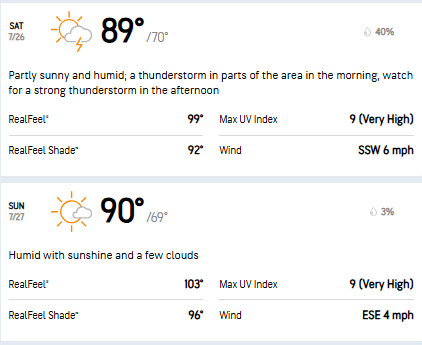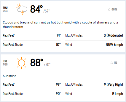 Rain is expected on Thursday and Saturday per the AccuWeather forecast. It will be hot and humid as usual in the Midwest this time of year.