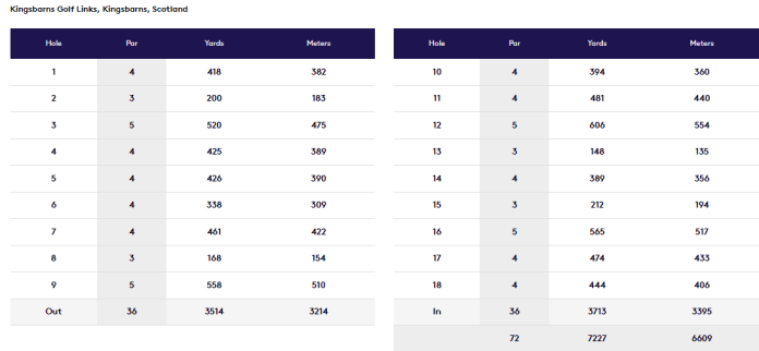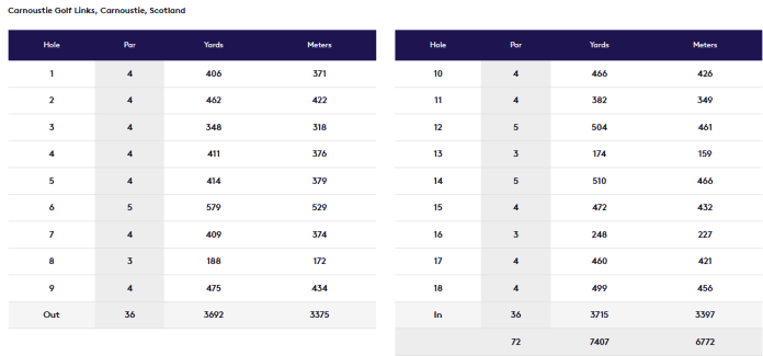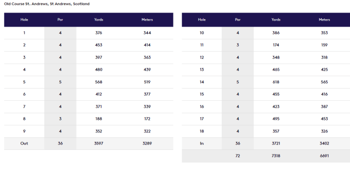 The Old Course at St. Andrews is known as the “Home of Golf,” and its history dates to the 15th century. It has hosted more British Opens than any other course (29) and currently hosts it every five years. The 7,318-yard, par-72 has a peculiar setup of 14 par-4s and just two par-3s and two par-5s. St. Andrews features seven double greens with huge, fescue/bentgrass putting surfaces. The 17th Road Hole, with its notorious bunker, and the closing 18th, which features the Swilcan Bridge and the Valley of Sin, are the most famous and iconic closing holes on the planet. Ross Fisher set the course record of 61 here in 2017. In the first three days of the tournament, the pins will be much easier for the professionals and amateurs but will be set up a lot tougher after the 54-hole cut.