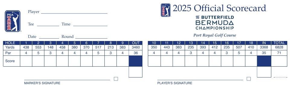 The track, owned and operated by the Bermuda government, is the shortest course on the PGA Tour at a par-71 of 6,828 yards. Half of the holes (1-6, 11-13) are played away from the coast and the other half (7-10, 14-18) are played on the seaside. Port Royal is predominantly constructed of TifEagle Bermudagrass (it is in Bermuda after all) on the fairways (rough only about two inches) and greens (average 8,000 square feet — third largest on tour and a slow 10 on the stimpmeter). Players have mentioned El Camaleon (Mayakoba Golf Classic) and the Plantation Course at Kapalua (Sentry TofC) as similar courses, mainly for the undulations.