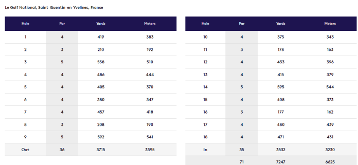 Le Golf National has hosted this tournament every year but two (1999 and 2001) since it opened in 1991. It hosted the 2018 Ryder Cup and the 2024 Olympics. This track usually plays as one of the more difficult layouts on the European Tour. The 7,247-yard, par-71 stadium course is a test for the very best golfers with a premium on accurate driving and, in particular, approaches to the difficult, undulating greens.
