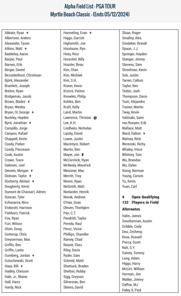 The field of 132 players for the inaugural Myrtle Beach Classic is as follows:
