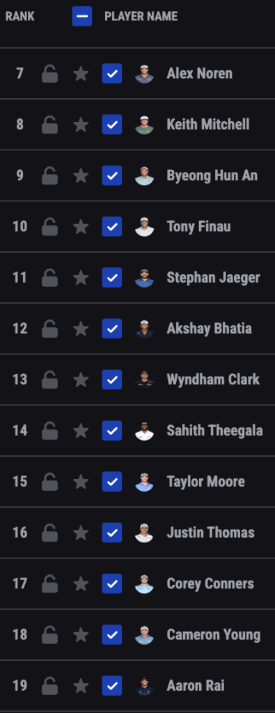 Xander Schauffele started things off with posting an incredible 9-under-62 and he has your first round lead (congrats to everyone who landed on him for FRL… I’m still kicking myself). He was exceptional tee-to-green and I don’t see that part of his game regressing anytime soon, because he’s been doing it all season. However, will he be able to keep up such hot putting? Likely not. And he’ll be having to fight off the likes of Rory McIlroy, Brooks Koepka, and of course, Scottie Scheffler. Scheffler led the first round in SG:T2G and looks like the old Scottie.