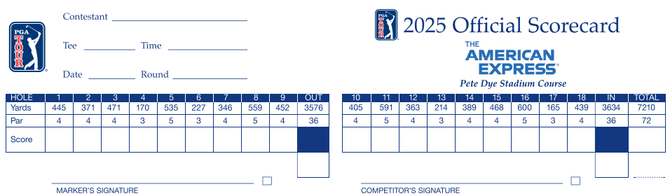 PGA West Stadium Course is played by each player in one of the three early rounds and then on Sunday. The track was designed by the legendary Pete Dye in 1986. It is a par-72 of 7,210 yards (10th shortest on tour) and usually plays one to two strokes harder than the Nicklaus and La Quinta courses. Water is in play on seven holes and there are 90 bunkers (sixth most on tour). Bermudagrass with Ryegrass comprise the fairways and rough while Poa overseed is the surface for the greens. The greens, at an average of 7,000 square feet (10th largest on tour), will run at an average speed of 11.5 on the stimpmeter.