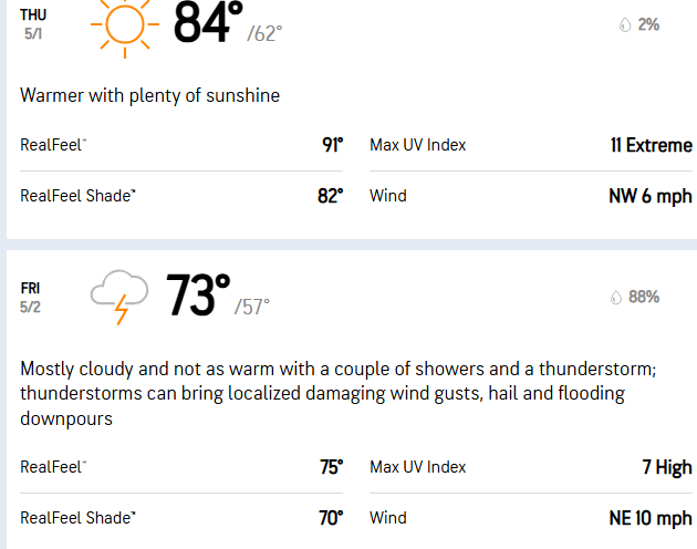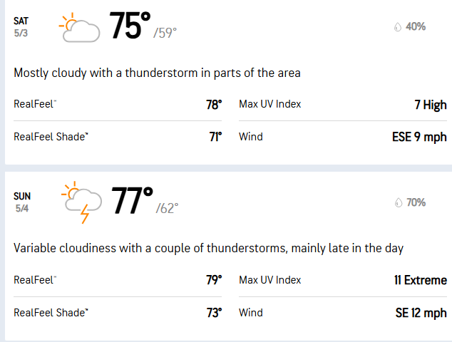 Light thunderstorms are expected on Thursday/Friday per the AccuWeather forecast.
