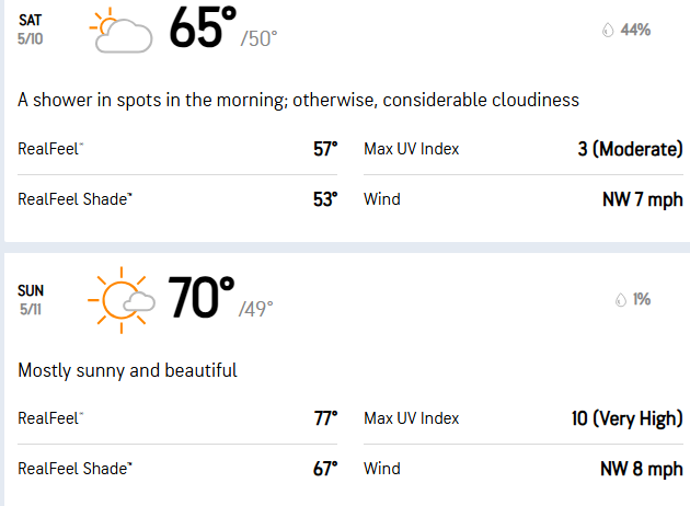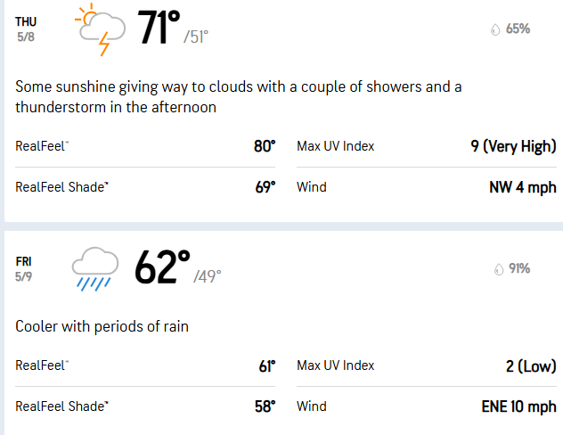 AccuWeather projects light rain Thursday afternoon and intermittently throughout Friday before clearing up over the weekend.