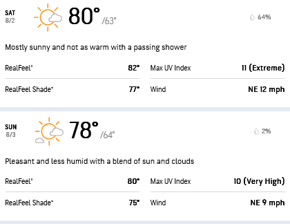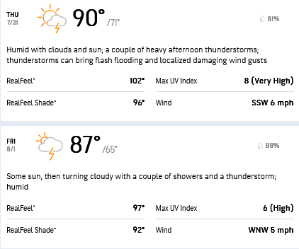 The AccuWeather forecast projects thunderstorms for the first two days but also a significant cooldown for the weekend.