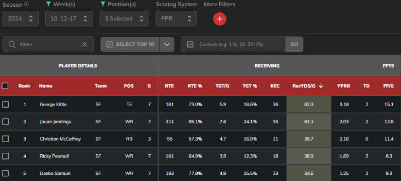 The 49ers’ top receivers in 2025 are likely to be Jauan Jennings, Ricky Pearsall, and George Kittle. In those players’ seven healthy games together last year, Kittle averaged 82.3 receiving YPG, which would have led all TEs over the past four seasons.