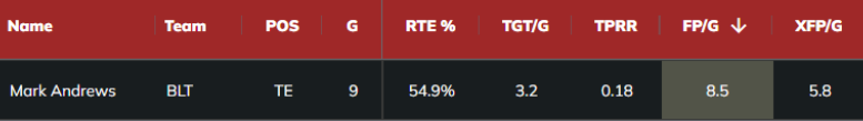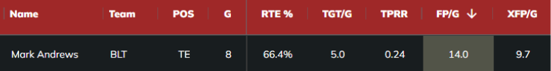But as Andrews’ health improved from Week 10 on, his route share grew to 66.4%, commanding 5.0 targets per game on a 24% TPRR, numbers much closer to his career rates. He averaged 14.0 FPG over this stretch (~TE4).