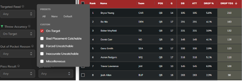 This is all to say that Young had no dependable outside WRs in 2024. Despite the lack of weapons, he ranked top-10 in accuracy and catchable throw rate on throws traveling 20 or more yards downfield, or top-15 in highly accurate throw rate when targeting an outside receiver (50.7%).