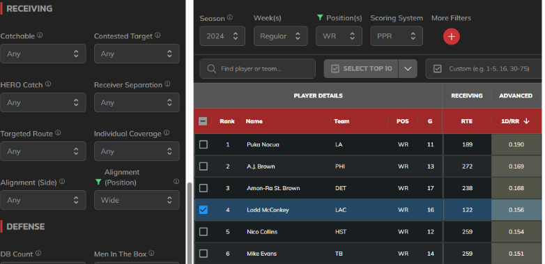 If you have a bias against slot WRs in fantasy football, McConkey is your chance to bury it. He turned his routes from the outside into chain-moving first downs as often as the league’s premier X receivers like Mike Evans and Nico Collins. It’s also instructive that McConkey ranks next to Amon-Ra St. Brown here, the poster boy of the “mostly-slot” archetype that many fantasy managers also foolishly faded after his rookie season.