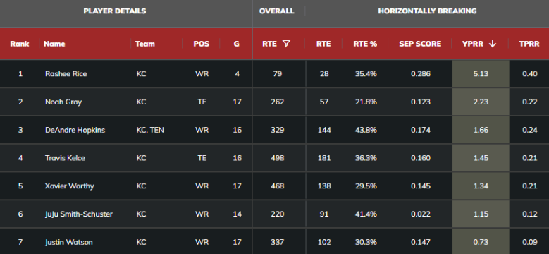 I’m not very high on Worthy’s ability to develop as a downfield threat, given how disfavorably he compares to other recent busts in these metrics. And I think it’s very likely Rice regains his favorable horizontal routes; they’ve made up 41% of his routes over his first two seasons (would have ranked top-12 at the position last year), and he averaged an absurd and league-leading 5.13 YPRR on them (albeit on a tiny sample) in 2024. The team spent much of the year trying to recreate that between DeAndre Hopkins, Travis Kelce, and JuJu Smith-Schuster to little success.
