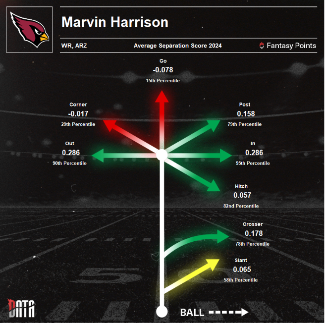 Zooming in further, Corner and Go routes alone made up nearly a third of Harrison’s route tree as a rookie, his frequency of each ranking above the 74th percentile. And these were by far his two worst routes from a separation perspective, ranking below the 30th percentile on each by Average Separation Score.