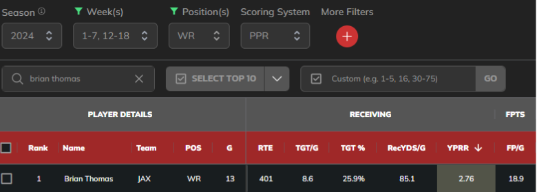 Brian Thomas Jr. played through a chest injury (with which it was initially reported he’d miss up to 4 games) from Weeks 8-11. If we throw those games out, Thomas would have averaged 2.76 yards per route run (YPRR), the most by any rookie in Fantasy Points Data history.