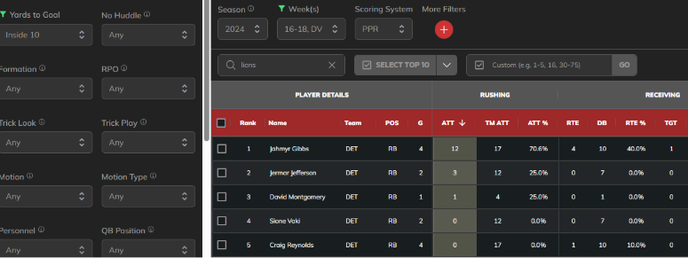 This isn’t to say I’d ever expect Gibbs to maintain that pace over a full season, with Montgomery healthy or not. But the more actionable way to look at this stat is to consider that Gibbs accomplished this insane feat on an unremarkable 66.4% snap share, which would have ranked just 10th-highest in 2024, near backs like Tony Pollard and D’Andre Swift. This isn’t that far off Gibbs’ 54.4% snap share with Montgomery healthy. He just efficiently amassed all the high-value touches (including 13 of 17 inside the 10-yard line) with Montgomery out or limited.