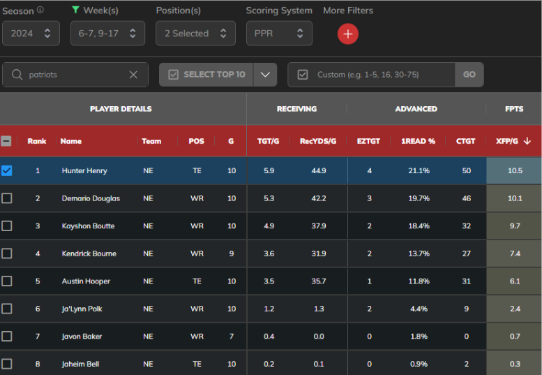 Across Drake Maye’s 10 full games, Hunter Henry led Patriots receivers in all of the following stats: targets per game (5.9), receiving YPG (44.9), first-read target share (21.1%), catchable targets (50), end zone targets (4), and expected fantasy points per game (10.5). He also ranked as the TE12 by Underdog FPG over this span.