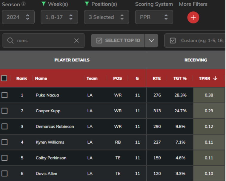 In their games together, Puka Nacua and Cooper Kupp effectively combined for a 67% TPRR. No other Rams player with at least 100 routes across these 11 games was targeted on more than 12% of their routes.