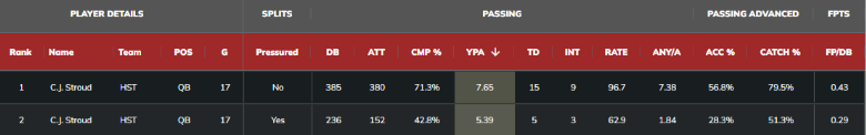 As with most QBs, pressure had a large impact on C.J. Stroud last year. Among 32 qualifying QBs, his “highly accurate” throw rate when pressured (28.3%) ranked 6th-worst in 2024. But that jumped to 56.8% on plays Stroud was kept clean (14th-best). And we can observe similar splits across most of his other stats: