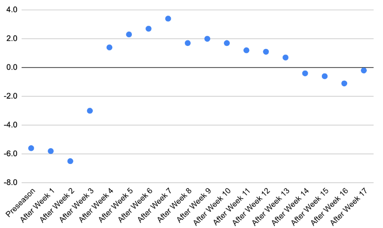 Above, you’ll see the Texans’ TSI rating as it fluctuated throughout the season. You can see that they started with basically no expectations of success and it maybe took the TSI model several weeks to finally calibrate where to rate them, which ultimately landed on league average (0).