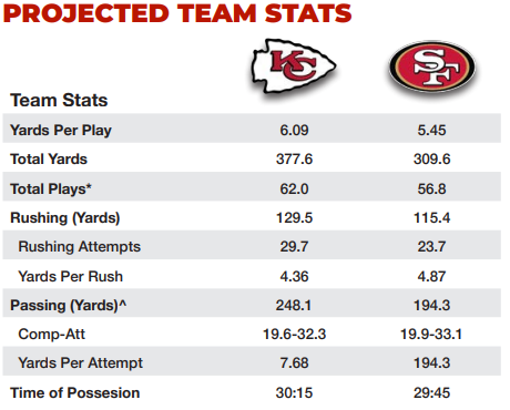 At this point in the season, you have to believe that the coaching staffs for both teams will try to generally stick with the recipe that got them to the Super Bowl. Using the assumptions made above in that Kansas City would total 377.6 yards on 62 plays and San Francisco would gain 309.6 yards on 56.8 plays, the number of runs and passes for each team would be broken up as follows: