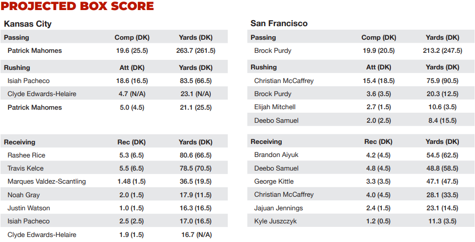 In this piece I will start by projecting the scores, time of possession, and yardage statistics for the Super Bowl LVIII contest overall, and then expand into the individual players and their projected output based upon these overall numbers. For enhanced accuracy, I have only utilized the last 10 meaningful games for each team, making the assumption that the performances in that span were more indicative of the teams’ themselves and the quality of opponents which they faced. I’ve made appropriate adjustments for where the teams had or played against teams with injured star players. For the record, I did ignore the regular season finales for both Kansas City & San Francisco, as each opted to rest numerous starters for those games.