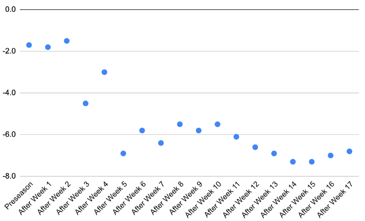 Above, you’ll see the Commanders’ TSI rating as it fluctuated throughout the season. Coming off of 2022, the Commanders didn’t have high expectations for 2023, as you can see by their 2-points-below-average power rating in the preseason; but, holy cow. TSI couldn’t downgrade them quickly enough, as you can see the (nearly perfectly linear) steep decline over the course of the season.