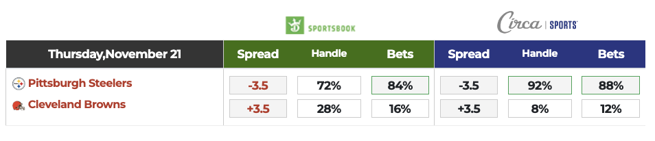 As you can see from the above graphic, Dave and Zach are in the distinct minority in backing the Browns on the spread. >>DK/Circa betting splits.