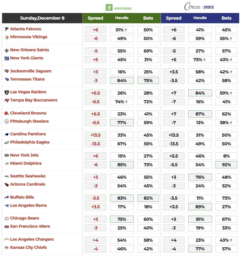 The top Circa Million picks for Week 14: Dolphins -5.5 (2,285), Bills -3.5 (1,753), Bears +4 (1,688), Chargers +4 (1,482), Browns +7 (1,443).