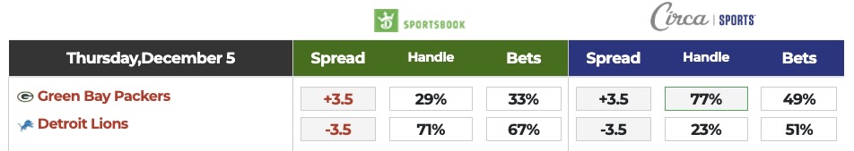 >DraftKings/Circa Betting Splits: DK moved to Lions -3.5 late Wednesday.