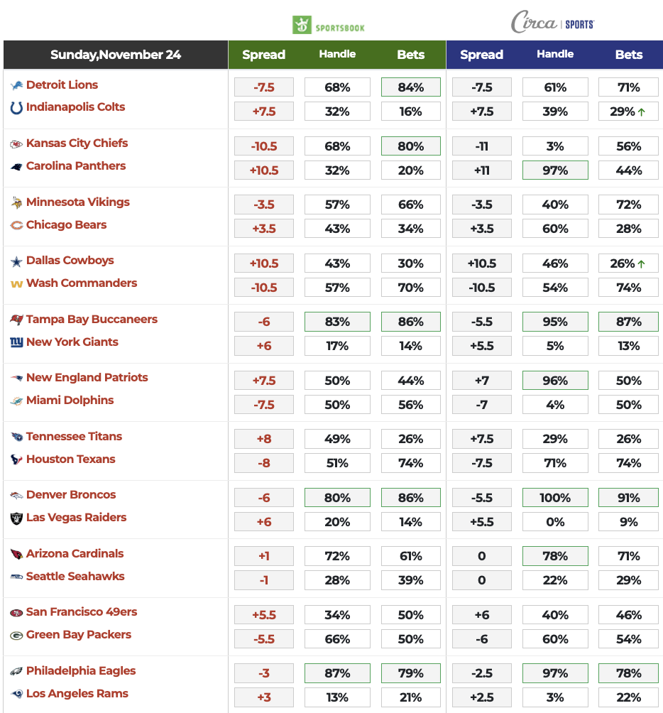 >DraftKings/Circa Betting Splits: The above chart shows a comparison of the betting splits from DraftKings and Circa Sports as of this beautiful and unseasonably warm Saturday night in Las Vegas. Keep an eye on them this morning for late action.