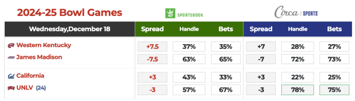 Western Kentucky finished the year 8-5 and earned a trip to the Conference USA Championship game. James Madison finished a respectful 8-5 after a mass exit of players to the transfer portal. In the last 3 weeks, these teams played games averaging over 58 points being scored. Three of these games were into the 60s. The eyeball test and recency bias says this should be an easy Over. According to VSIN’s betting splits, 63% of bets agree and are on the Over. However, a deeper look shows us that there is a chance of 14 MPH winds with rain. We know that wind is a major factor in game totals. Plus the strength of this James Madison team is the defense, 49th in the country and the Western Kentucky offense ranks 150th in the country. To add to all this, James Madison is starting a QB that only has 1 pass attempt this year and 59 in his career. If there is one this VSIN’s Josh Applebaum has taught us it’s that the line should move to where 63% of the bets are. However this total opened 53.5 and has dropped to 51.5. his reverse line movement is due to the sharp split of 37% bets but 71% of the money on the under. Let’s go with under 51 in the Boca Raton Bowl.